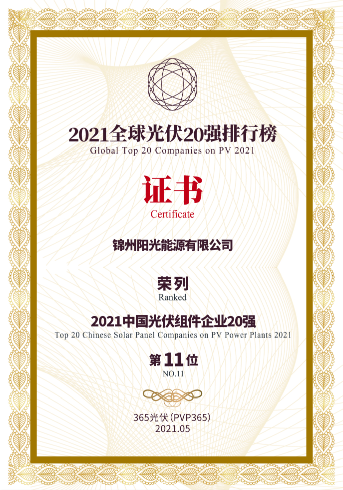 2021全球光伏20強(qiáng)排行榜榮譽(yù)證書