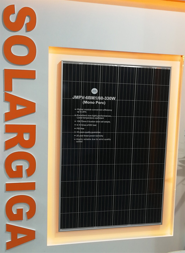 此次錦州陽光能源團隊攜最新產(chǎn)品亮相A1-410展臺,備受全場關注。60片方單晶組件(Mono perc)(JMPV-6BM1/60-330W),72片多晶335W組件Poly(JMPV-6P/72-335W)等高效組件吸引了眾多參展觀眾。